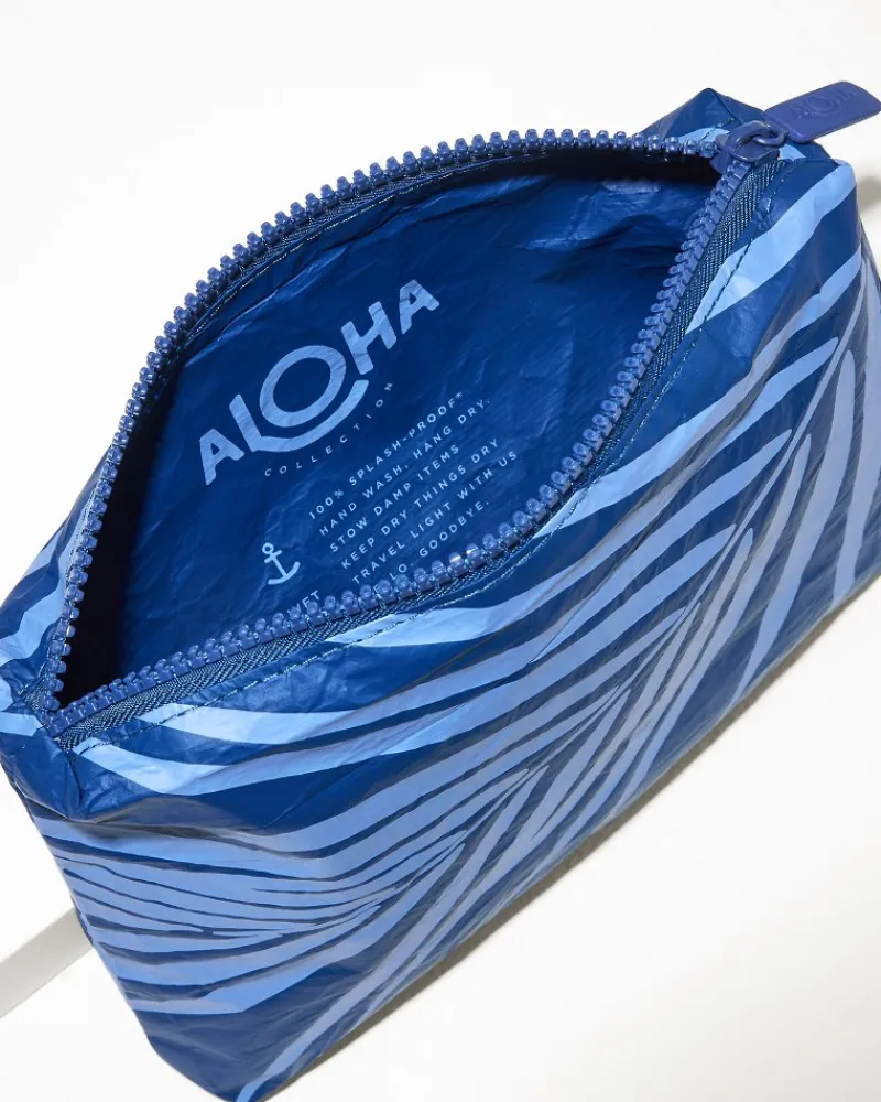 Perfect for packing cosmetics, swimsuits, and any other travel necessity, this blue palm print pouch is SPLASH-PROOF®, making it your ideal beach vacation companion.