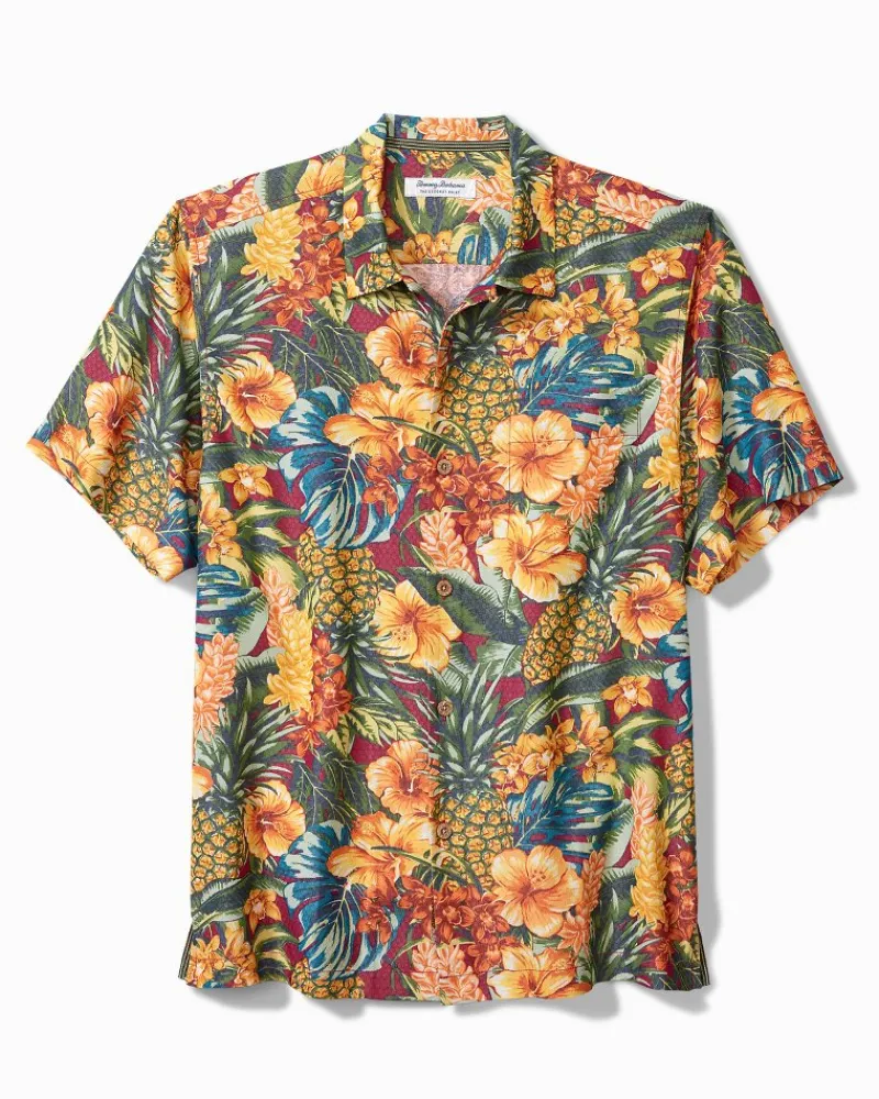 Make your island spirit known in this statement-making camp shirt, featuring a maximalist tropical design with pineapples and hibiscus galore. Crafted from a lightweight and wrinkle-resistant blend that helps wick away moisture, it transports you straight to paradise-like comfort.