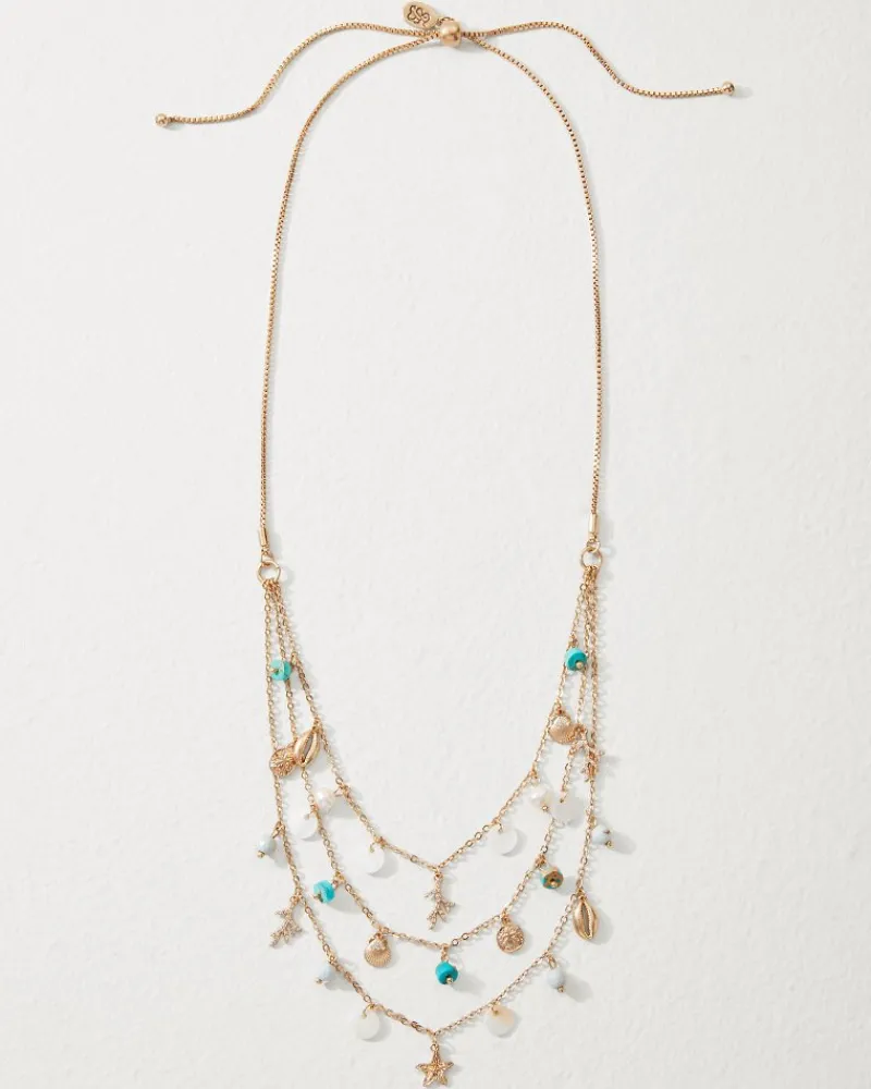 Small, dainty charms, from semi-precious stones to delicate pearls and decorative shells, make quite the statement in this effortless, layered necklace that epitomizes coastal glamor.