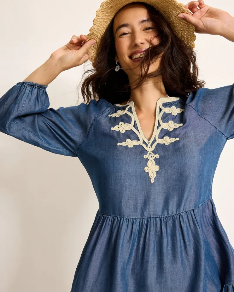 Take of-the-moment trends to the shore in this chambray coverup dress, complete with elegant balloon sleeves, a tiered hem, and elevated embroidery along its chic notched neckline.