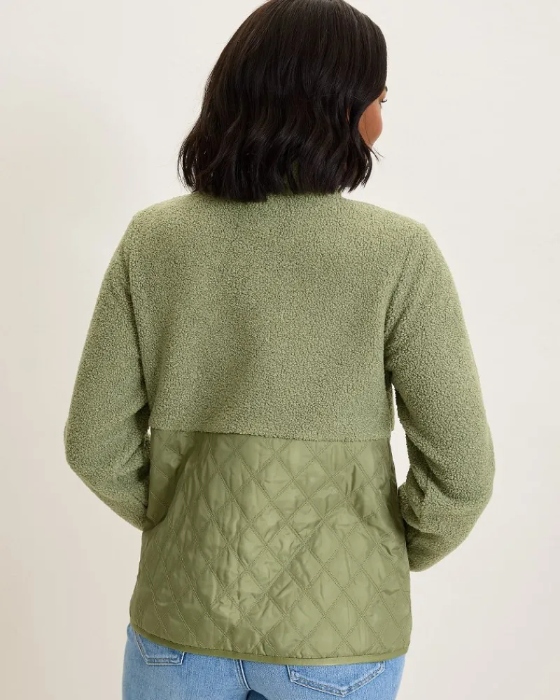 Keeping cozy is always a trendy occasion in this hybrid full-zip jacket. Designed with a plush—but not too thick!—fleece exterior and elevated by quilted details, this style instantly adds interest to any casual ensemble, whether you wear it as a mid layer or a final layer.