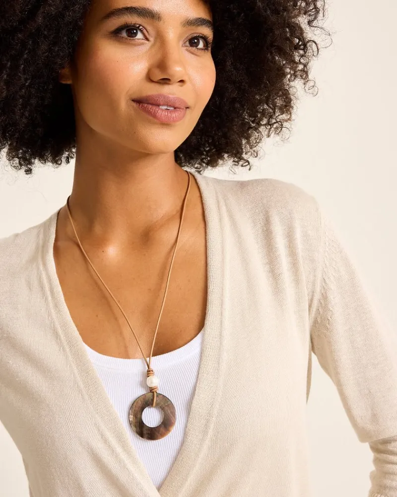 Rustic appeal meets coastal charm in this chic corded necklace, featuring a mesmerizing circular shell and an elegant freshwater pearl.