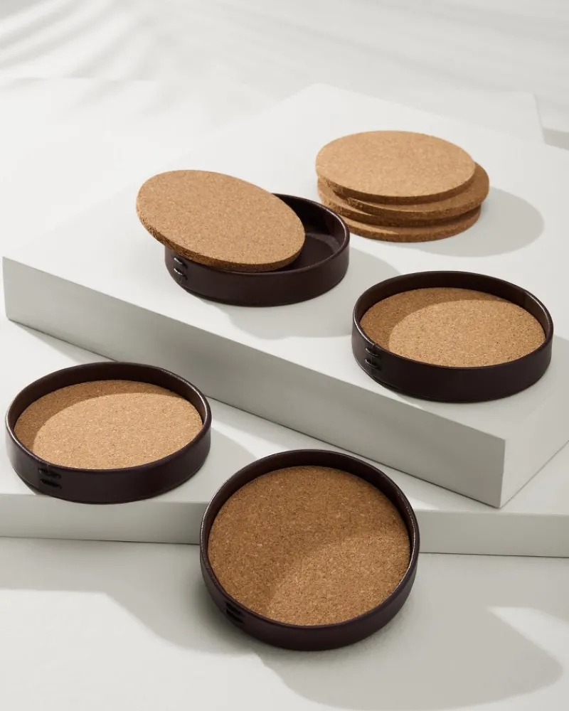Preserve your tabletops with a timeless set of leather coasters, thoughtfully designed with a raised leather rim and a weighted cork base.
