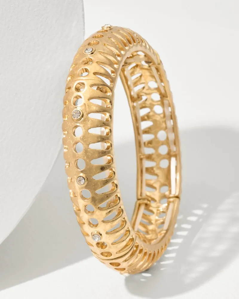 Elevate any ensemble with this elegant gold bangle, featuring an intricate openwork design that’s detailed with subtle hints of sparkle.