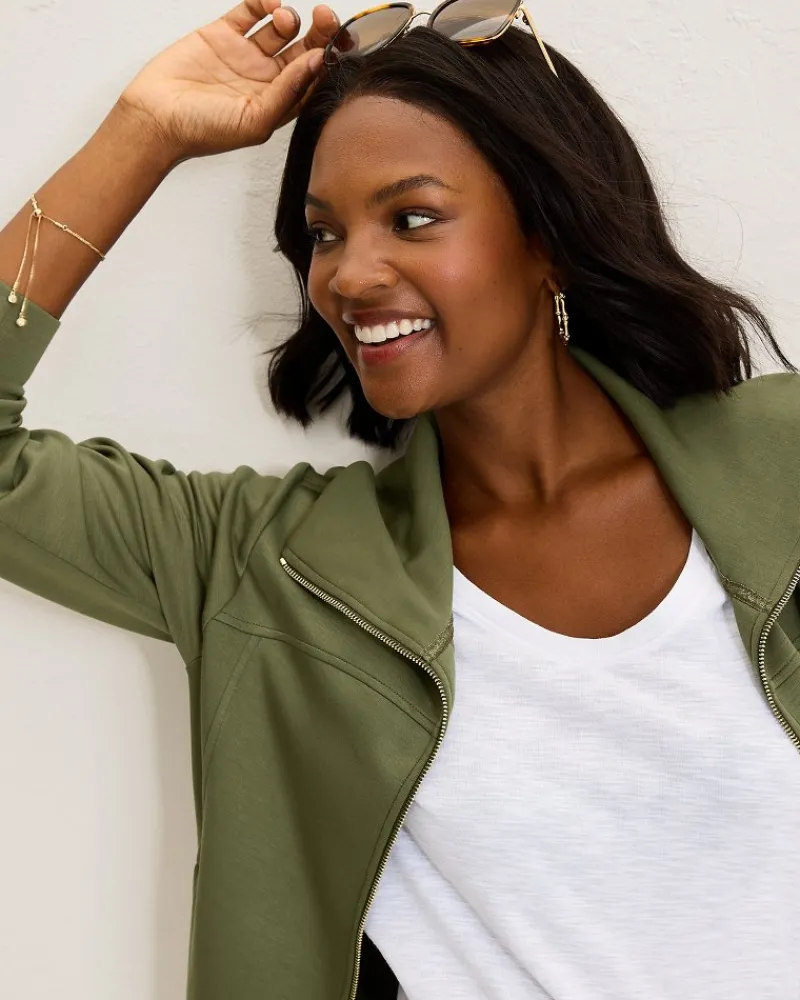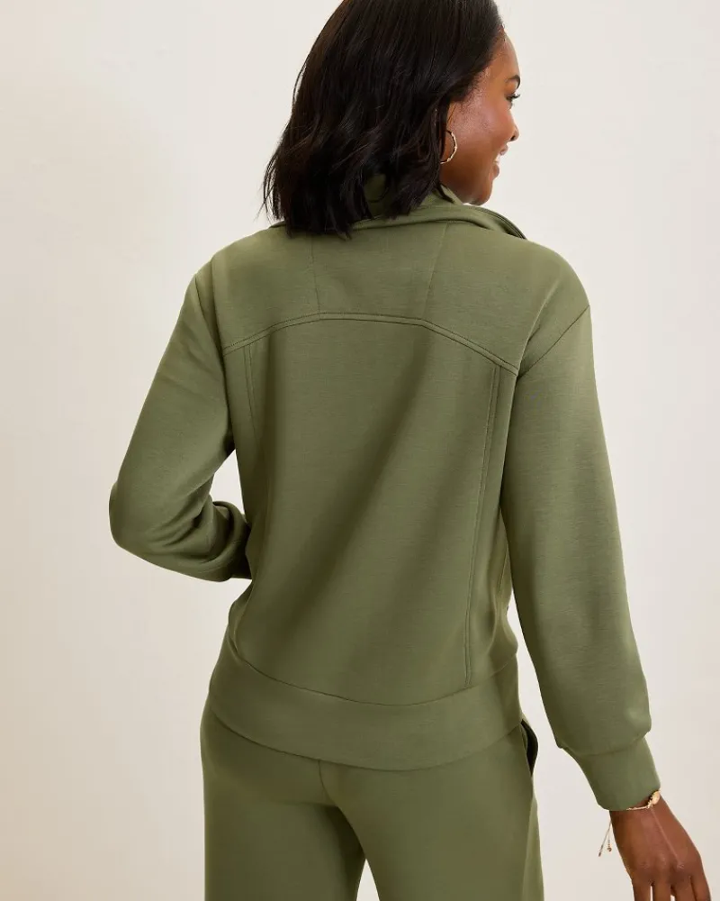 Experience unparalleled relaxation in this butter-y soft full zip, designed with a chic relaxed collar and crafted from an ultra-lightweight spacer fabric with 4-way stretch and an effortless drape. Paired to its matching pintuck or wide-leg pants, the matching set is your ticket to premium comfort.