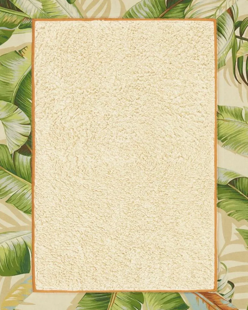 The Palmiers Bath Rug features dramatic tropical foliage in deep greens and neutral tones with a coral accent, bordering the tan center of the rectangular rug. This gorgeous tufted rug creates a look that is both relaxed and visually dynamic.