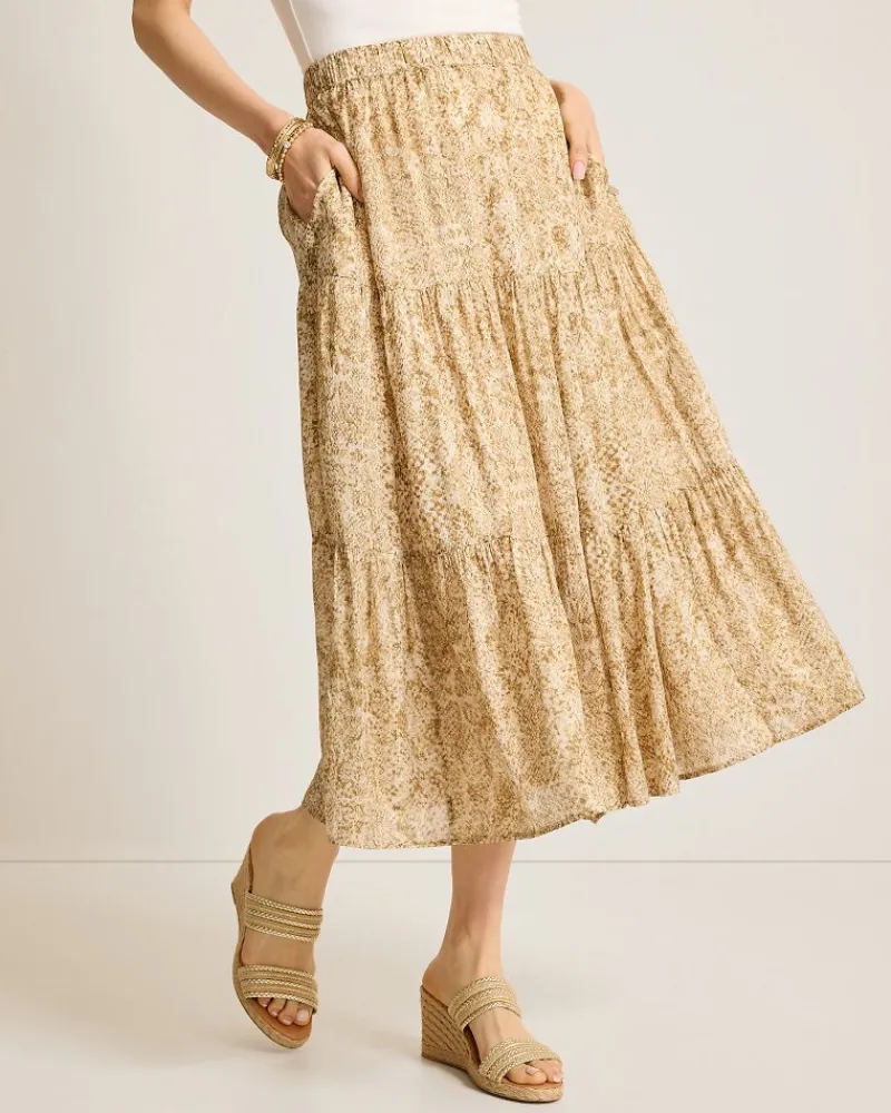 Elegance meets attitude in this chic, tiered midi skirt, featuring an elevated snake print with subtle shimmer accents. Style with its matching peasant top for an effortlessly charming ensemble.