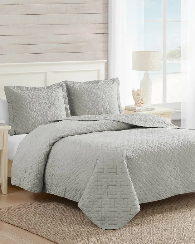 Our Tommy Bahama Raffia Solid Quilt Set was inspired by the casualness of a beach home. This fully reversible quilt features a grey front and reverse, with a unique basketweave stitch pattern. Lightweight and easy to layer, this bedding set is sure to whisk you away to the oasis of your dreams every night.