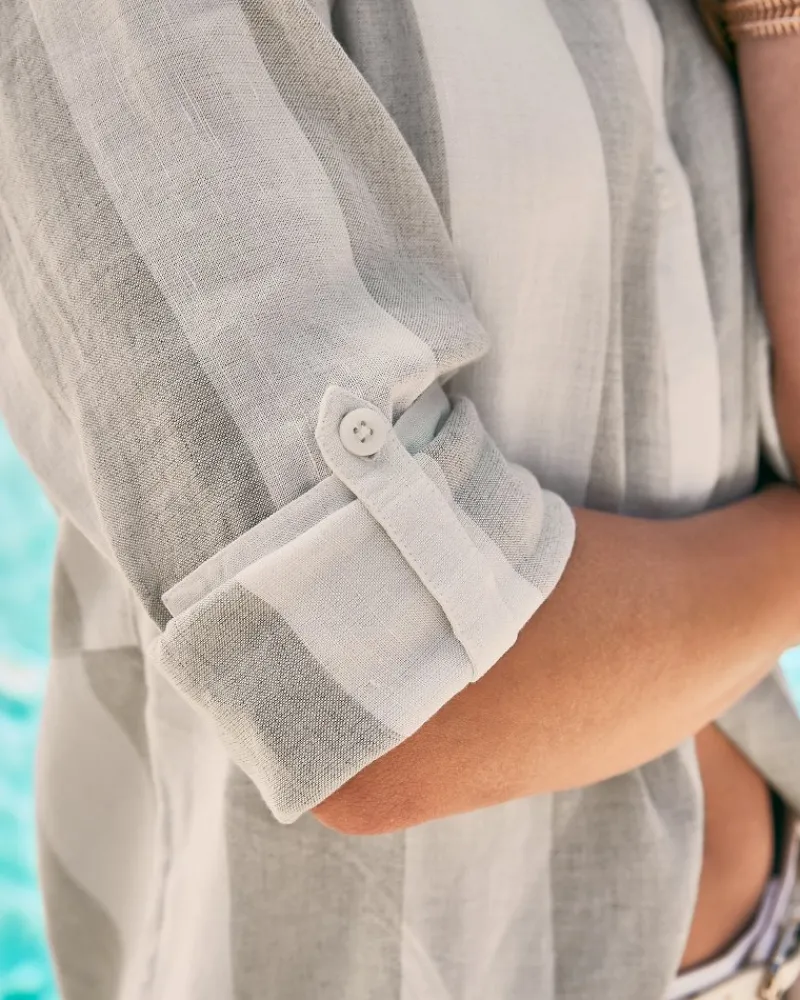 Roll up your sleeves in this relaxed boyfriend beach shirt. Casual stripes and pockets make this your go-to coverup for effortless style—perfect for an afternoon at the beach or on the boat.