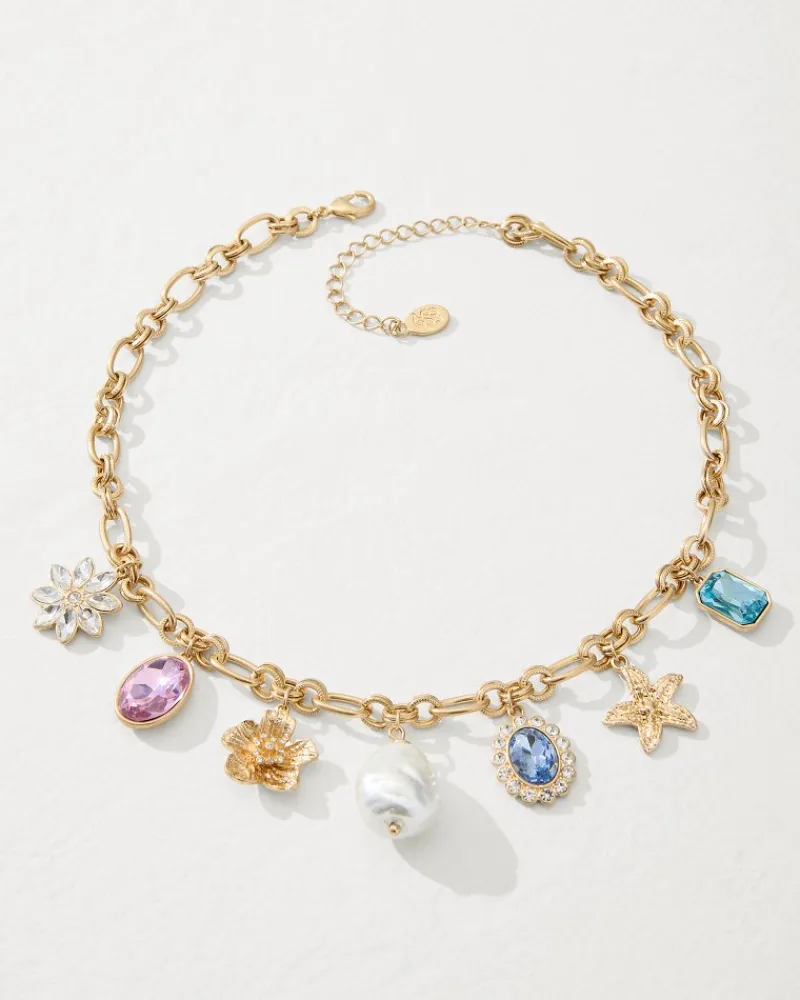 Your everyday style is anything but boring when you wear this colorful charm necklace, complete with pearl accents and embellished gems.