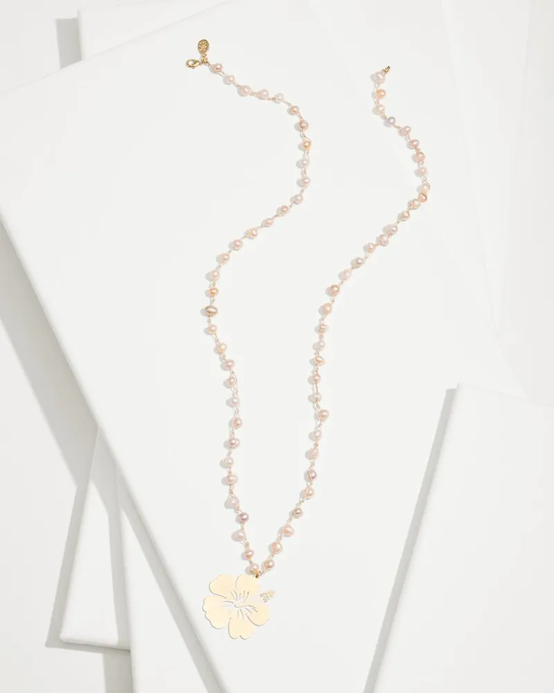 Segmented light pink pearls along an elongated necklace set an effortlessly elegant tone for your look, complete with a delicate gold charm in the shape of a hibiscus.