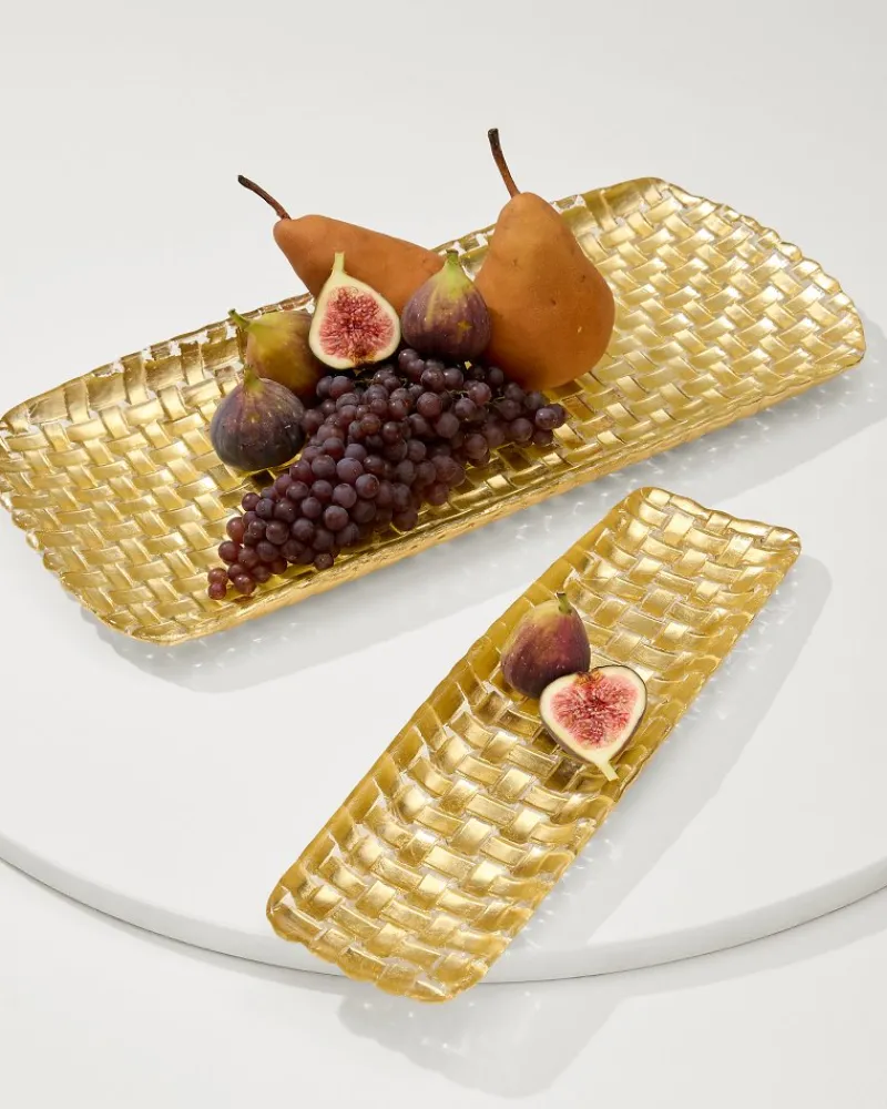 Elegantly serve up hors d’oeurves and festive bites at your next cocktail hour with these gorgeous glass trays, featuring a timeless braided design and a rustic gold finish.