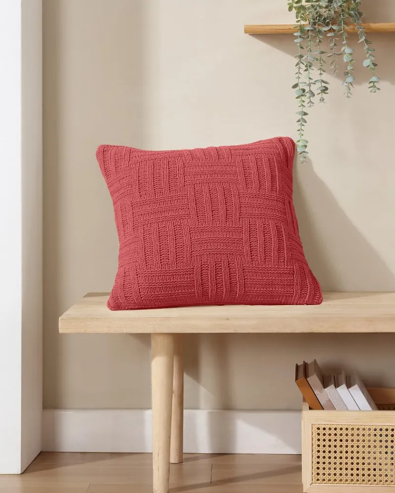 Elevate your sanctuary and make it extra cozy and comfy with this soft knit pillow, featuring a unique woven design.