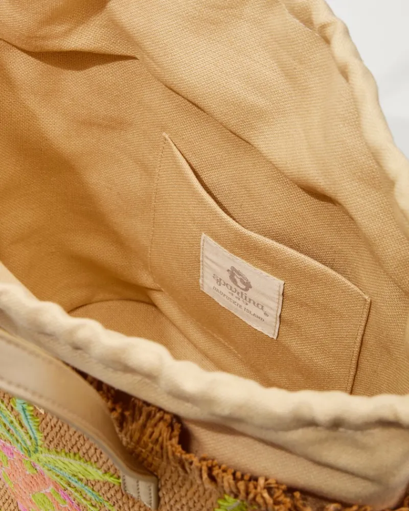 Colorful papyrus embroidery amplifies the island-inspired appeal of this luxurious straw tote with a spacious, linen-lined interior and chic drawstring closure.