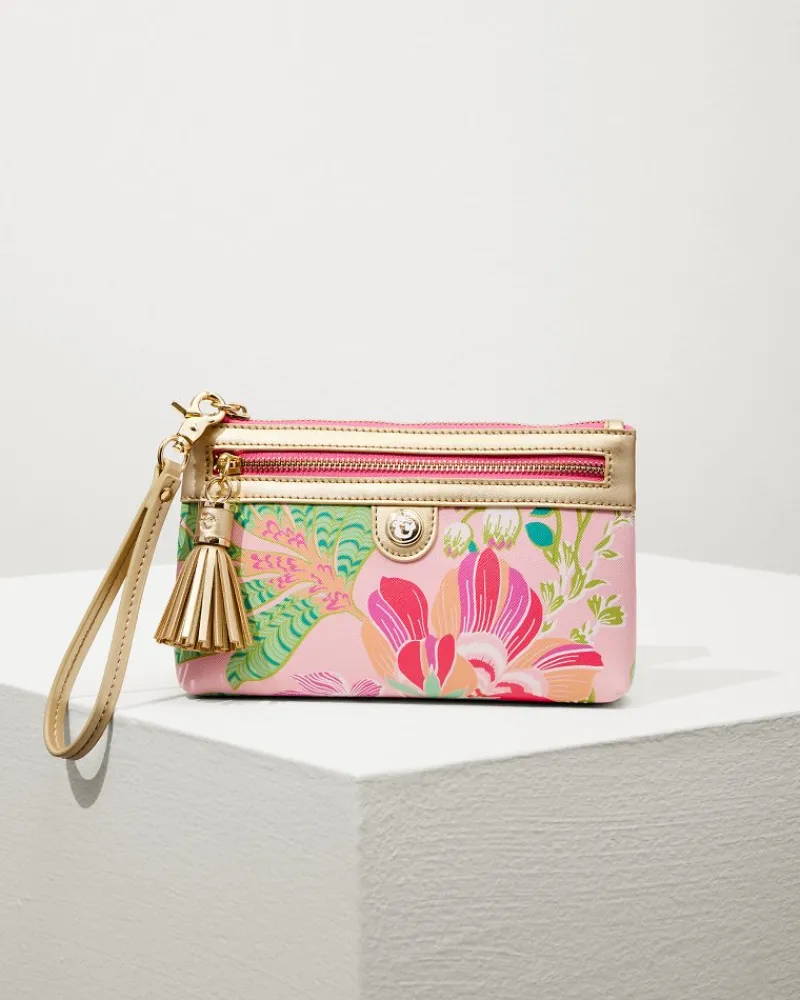 Conveniently carry every little essential—from credit cards to keys—in this stylish printed wristlet, featuring gold contrasting trim, a tassel detail, and sweet hint of sparkle.