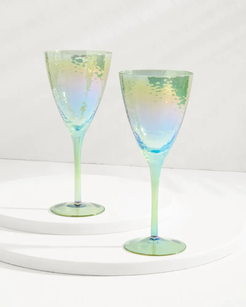 A unique hammered texture with a mesmerizing, colorful finish elevates this pair of modern wine glasses, a perfect gift for the at-home entertainer with an elegant aesthetic.