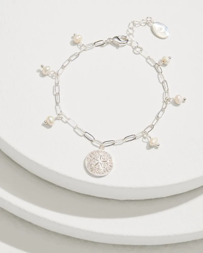 Featuring dangling pearls and an embellished starfish charm, this silver chain link bracelet adds an elegant hint of sparkle to any look.