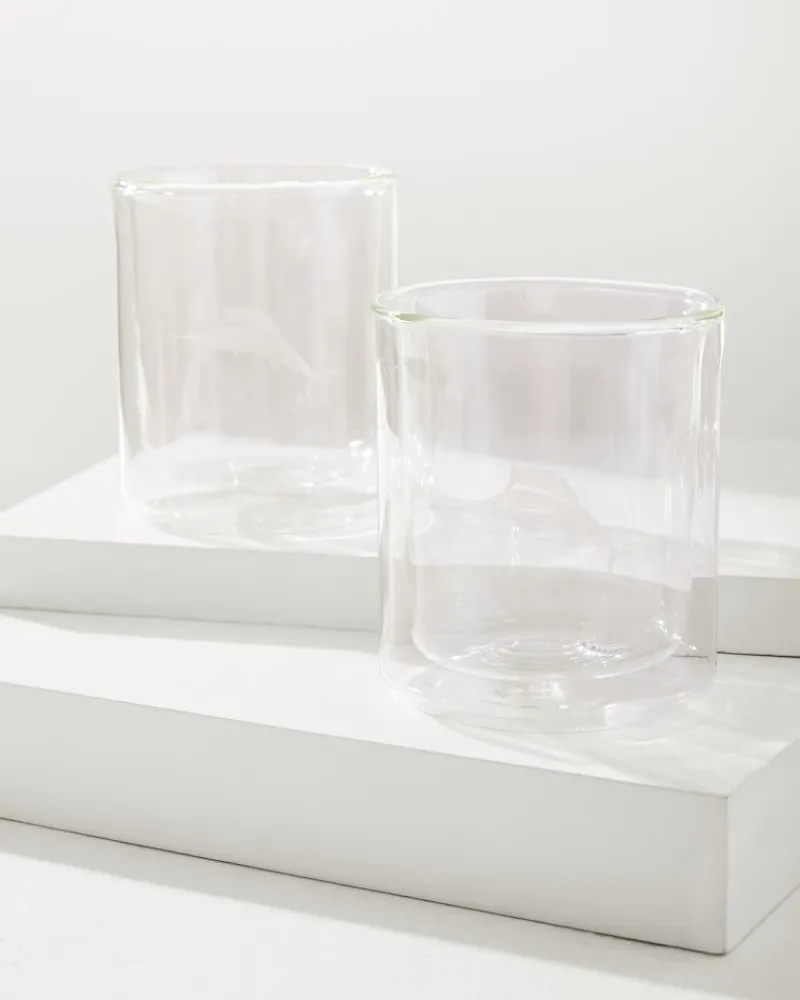 Expand your barware collection with this dishwasher-safe set of double-walled rocks glasses, perfect for your next homemade cocktail.