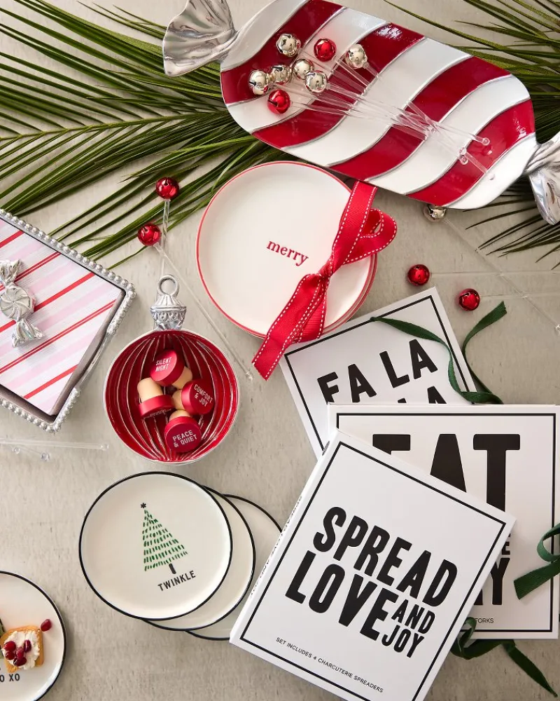 A gorgeous, red ornament-shaped dish, adorned with silver trim, adds a festive spirit to your decorative holiday spread.