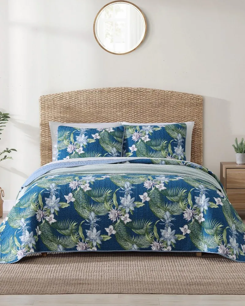 Inspired by southern coastal cities, our Tommy Bahama Southern Breeze Quilt Set features tropical florals in blues and purples and palm leaves in green on an indigo ground with a blue reverse. Lightweight and easy to layer, this fully reversible quilt will infuse your nighttime routine with some tropical ease for unparalleled rest and relaxation.
