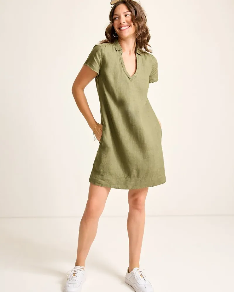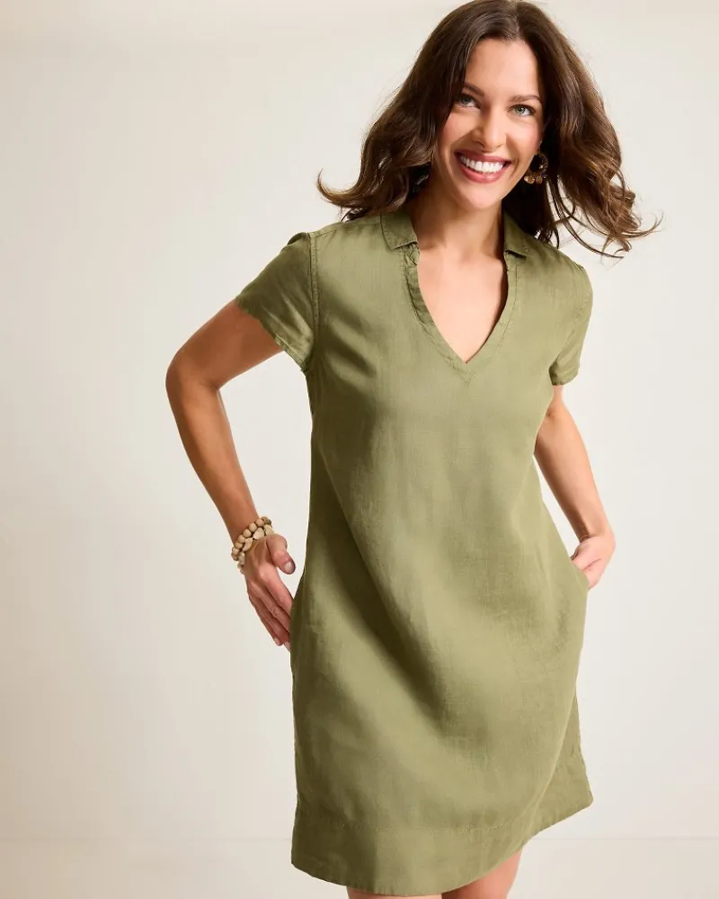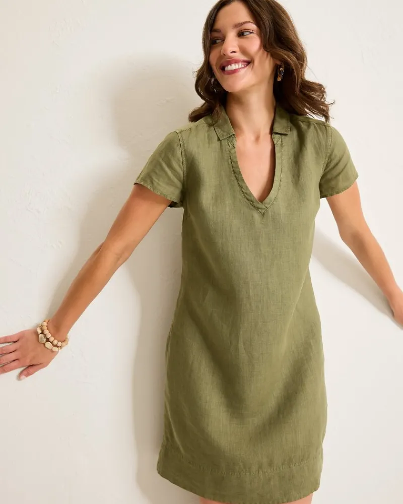 Tommy Bahama Two Palms Short-Sleeve Linen Collared Dress Tea Leaf New